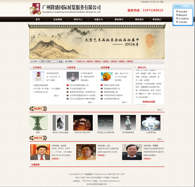 广州隆盛国际展览服务公司成立于2012年;由广州市工商行政管理局、广州市文化局、广州市文物管理局核准注册。作为我国华南地区重要的国家商贸文化中心广州,其艺术品的交易与收藏非常活跃,吸引了包括香港、澳门、台湾、新加坡、马来西亚、泰国等国家的收藏者的目光,隆盛国际在这片投资热土上应运而生,我们将联合北京、上海、广州、香港等地众多大型优质拍卖机构,为中国艺术收藏品爱好者提供一个集展览、拍卖、鉴定和销售的艺术品交易平台。
