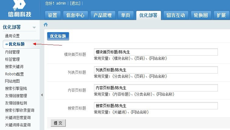 而在优化标题中可以分模块设置网页标题,并列出了能够使用的变量